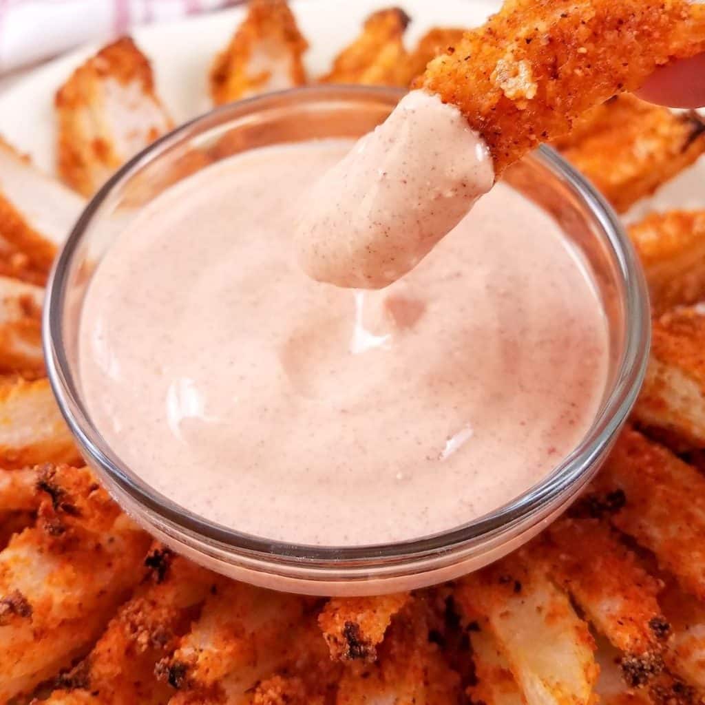 - While the onion is air frying, mix the Greek yogurt, hot sauce, chili powder, and garlic salt together in a bowl. Set aside in the fridge until you’re ready to serve. ¾ cup Greek yogurt, 1 tbsp hot sauce, 1 tsp chili powder, ½ tsp garlic salt
